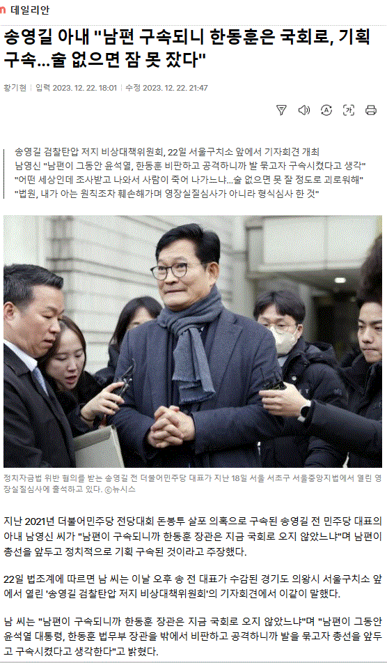 송영길 아내 "남편 구속되니 한동훈은 국회로, 기획구속…술 없으면 잠 못 잤다"