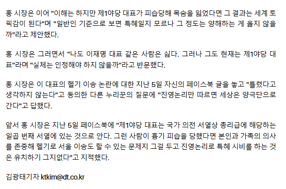 홍준표 "이재명 목숨 잃었다면 세계 토픽감…헬기 이송 양해해야"