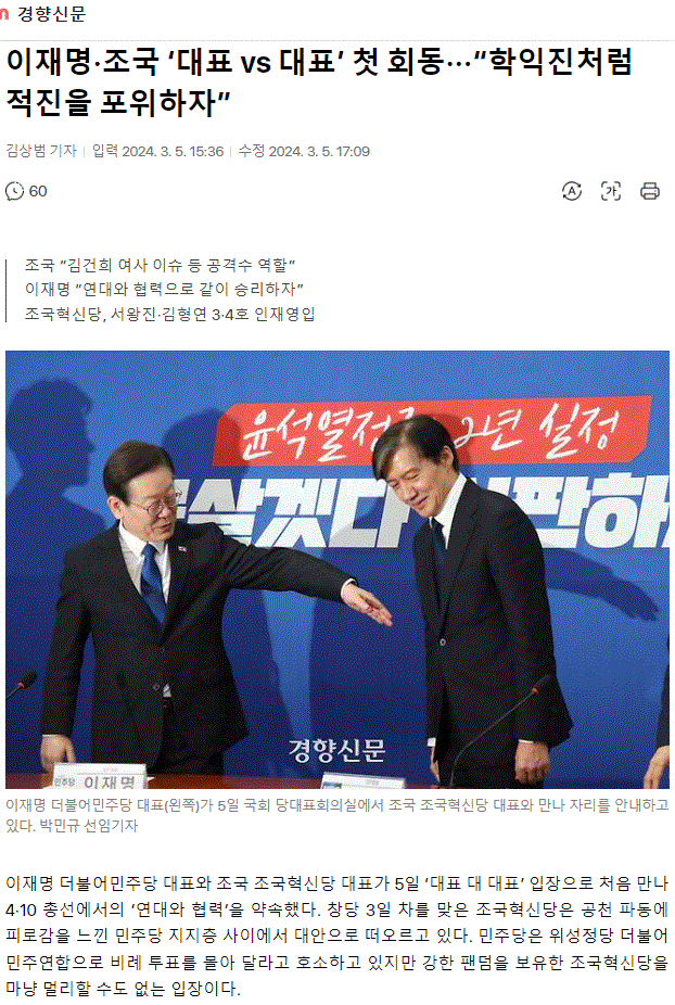 이재명·조국 ‘대표 vs 대표’ 첫 회동···“학익진처럼 적진을 포위하자”