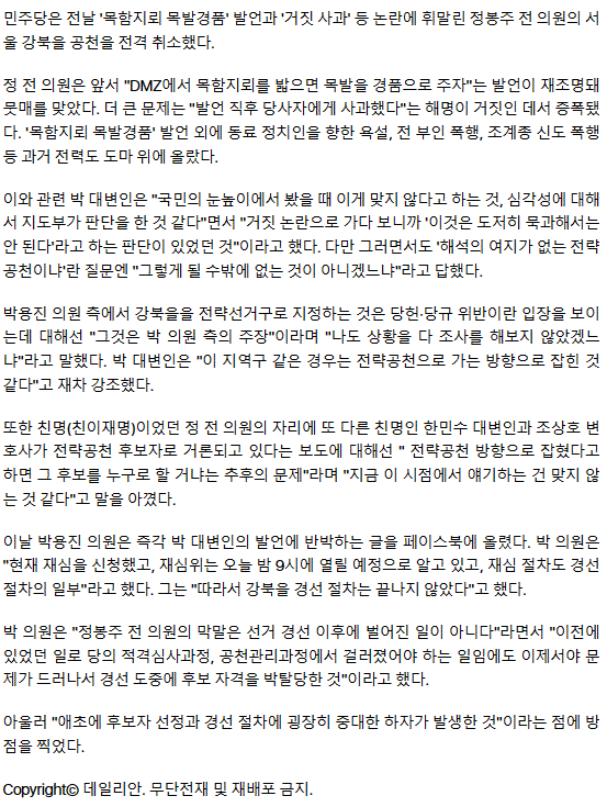 정봉주 날렸어도 박용진은 안된다?…박성준 "공석된 강북을 전략공천"