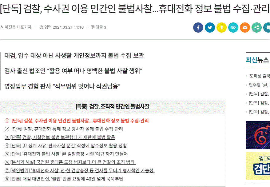 [단독] 검찰, 수사권 이용 민간인 불법사찰...휴대전화 정보 불법 수집‧관리