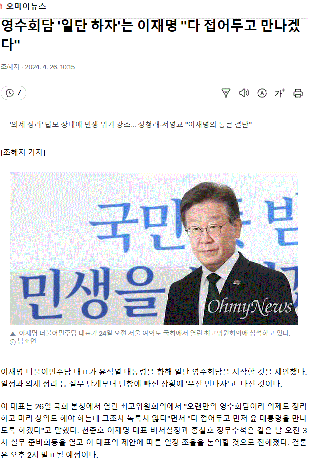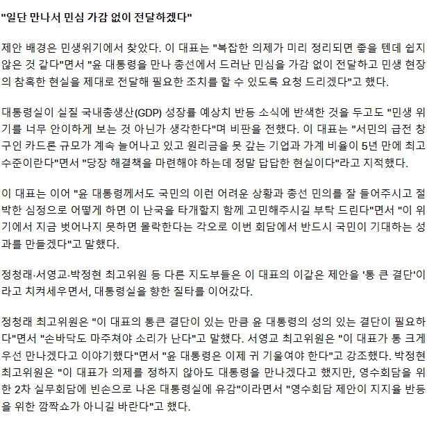 영수회담 '일단 하자'는 이재명 "다 접어두고 만나겠다"