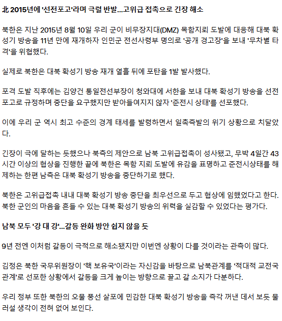 북, 9년전엔 확성기 켜자 굽혀…이번엔 '강대강' 갈등 확대 우려
