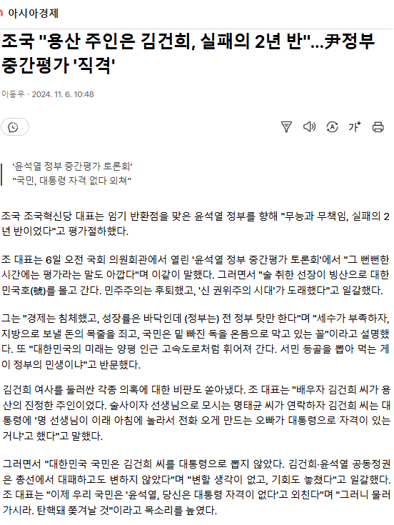 조국 "용산 주인은 김건희, 실패의 2년 반"… 尹정부 중간평가 '직격'
