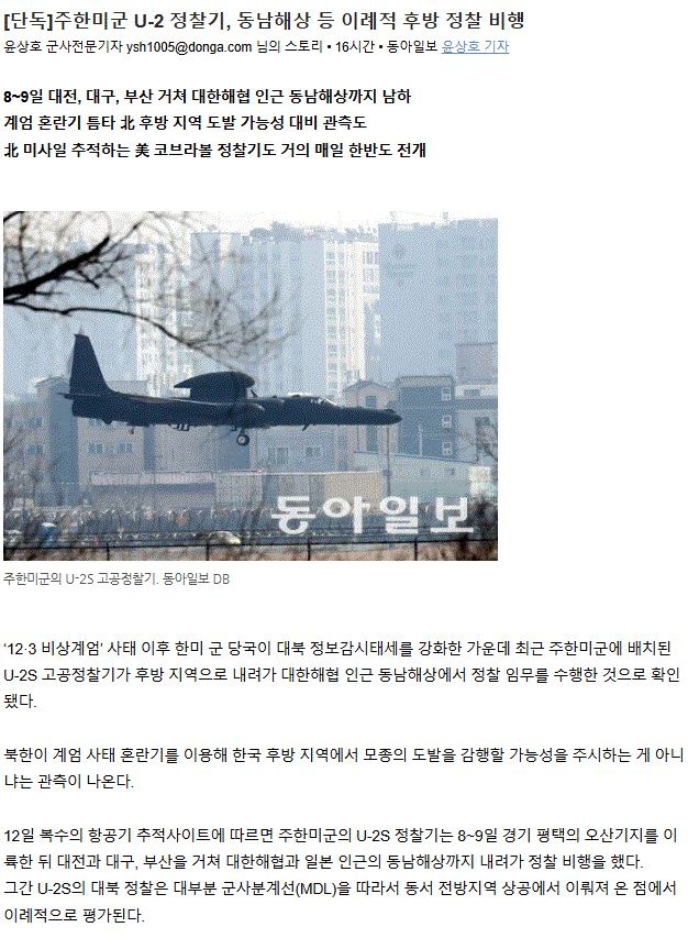 [단독] 주한미군 U-2 정찰기, 동남 해상 등 이례적 후방 정찰 비행