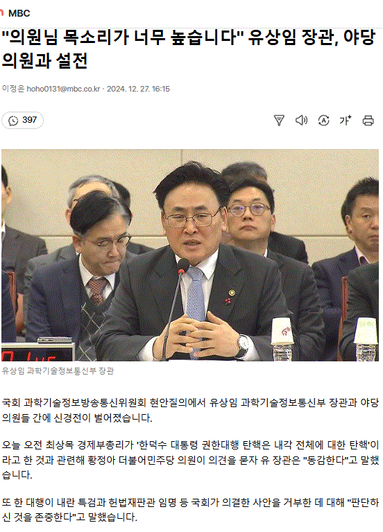 "의원님 목소리가 너무 높습니다" 유상임 장관, 야당 의원과 설전 ㅡ내란선동하는 장관
