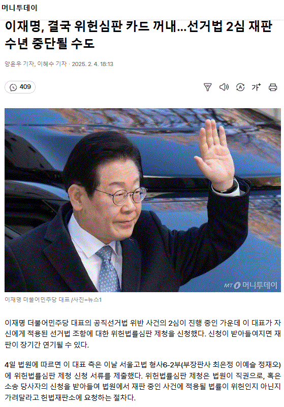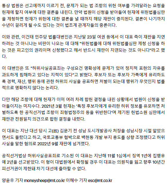 이재명, 결국 위헌심판 카드 꺼내… 선거법 2심 재판 수년 중단될 수도
