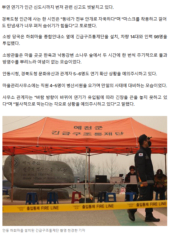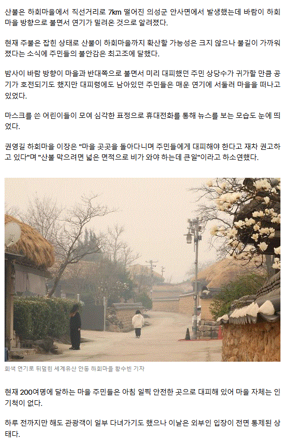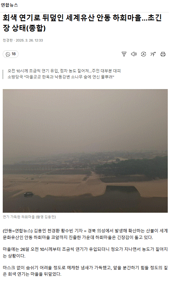 회색 연기로 뒤덮인 세계유산 안동 하회마을… 초긴장 상태(종합) ㅡ 전광훈 고향 의성군 신평면에서 산불이 났을까 의심