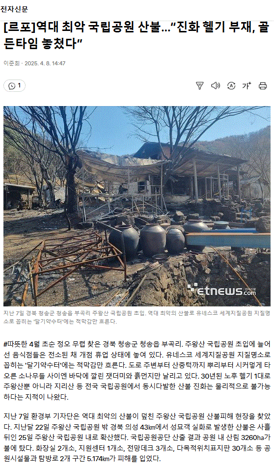 [르포] 역대 최악 국립공원 산불… “진화 헬기 부재, 골든타임 놓쳤다”ㅡ 호마의식 도와준 거니
