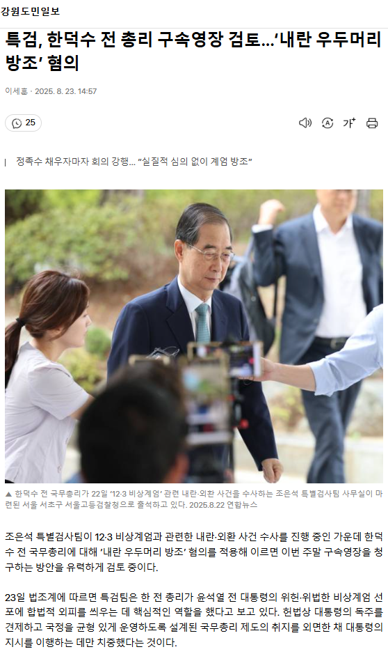 특검, 한덕수 전 총리 구속영장 검토… ‘내란 우두머리 방조’ 혐의
