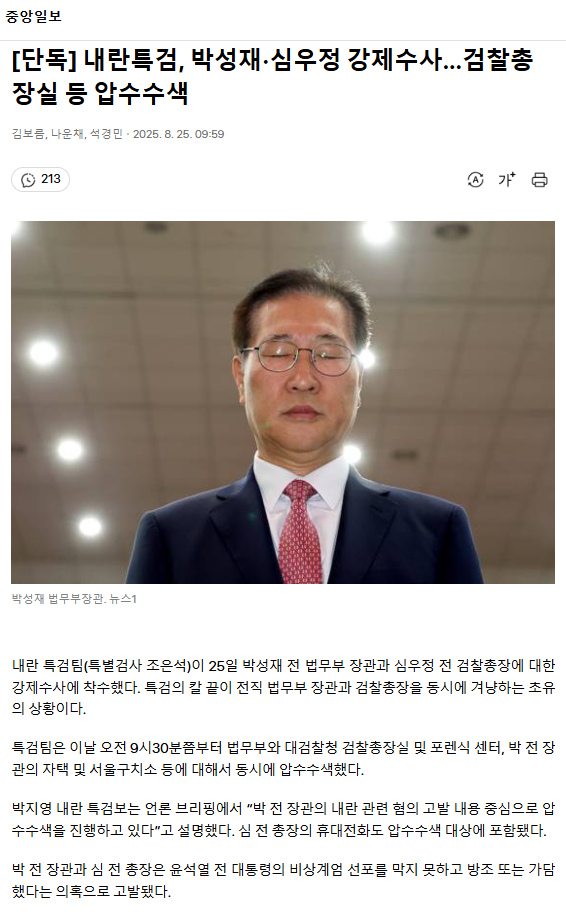 [단독] 내란특검, 박성재·심우정 강제수사… 검찰총장실 등 압수수색 ㅡ 박, 심을 구속하라