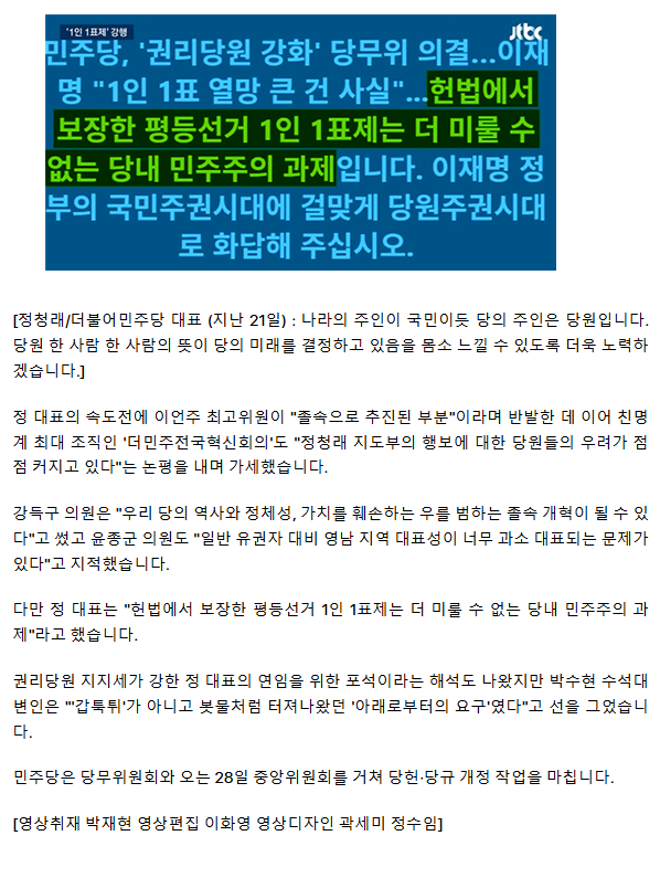 여기 댓글 쓴 사람들 중에 논리가 이상한 사람들이 많네요 1인1표제 정청래당대표공약입니다 ㅋㅋㅋ 압도적득표율로 당선된 당대표공약 지키는데 지금 머하는겁니까? 지금 당대표선거불복하는겁니까?
