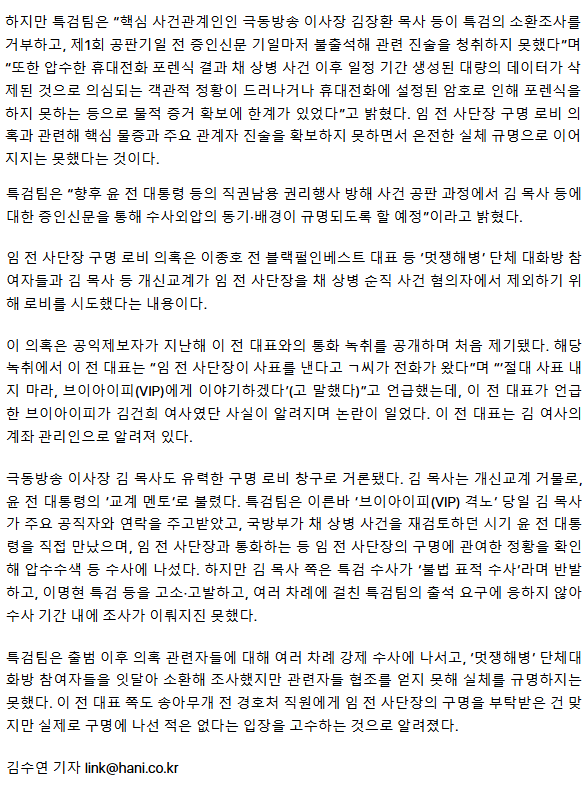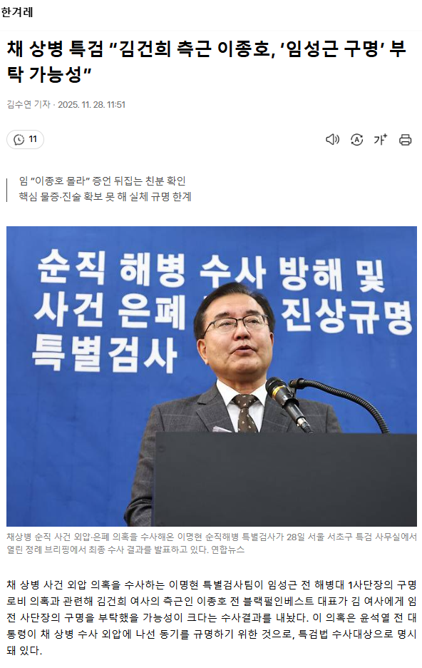 채 상병 특검 “김건희 측근 이종호, ‘임성근 구명’ 부탁 가능성”