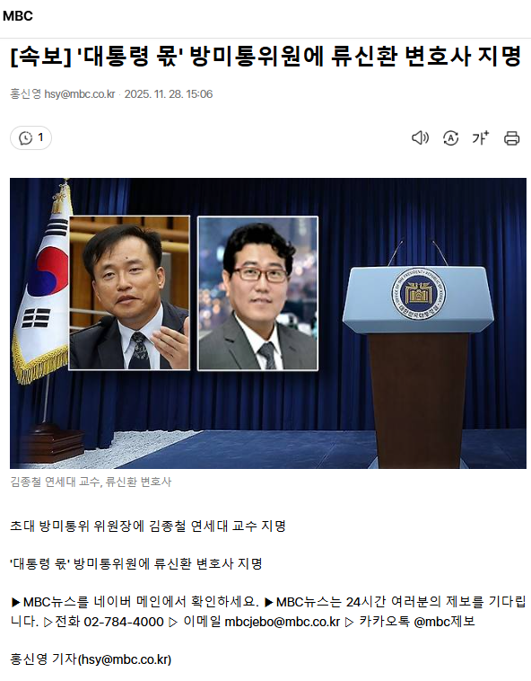 [속보] '대통령 몫' 방미통위원에 류신환 변호사 지명 ㅡ 위원장에 김종철 연세대 교수