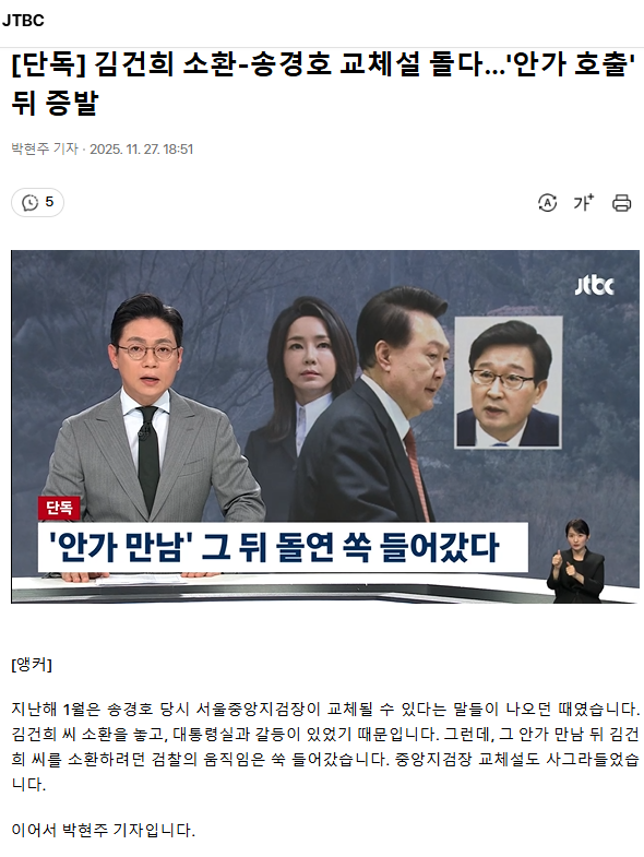 [단독] 김건희 소환-송경호 교체설 돌다… '안가 호출' 뒤 증발
