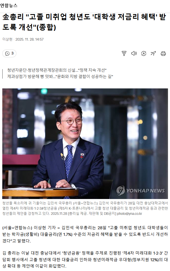 金총리 "고졸 미취업 청년도 '대학생 저금리 혜택' 받도록 개선" (종합)