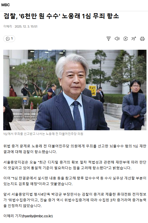 검찰, '6천만 원 수수' 노웅래 1심 무죄 항소 ㅡ 검찰은 선택적 기소