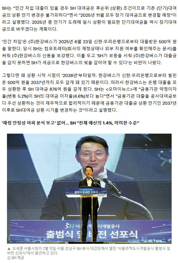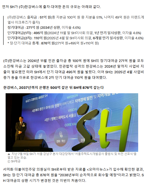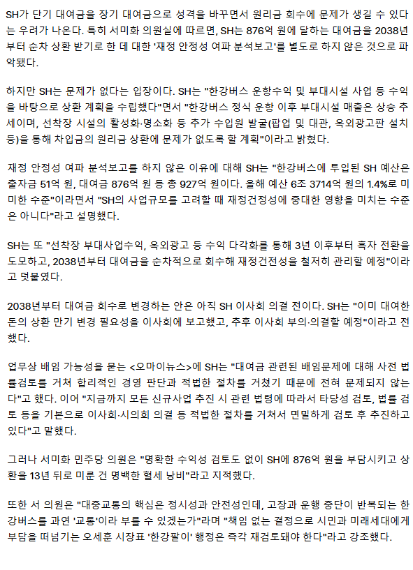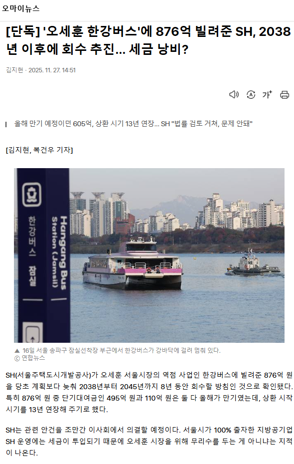 [단독] '오세훈 한강버스'에 876억 빌려준 SH, 2038년 이후에 회수 추진... 세금 낭비?