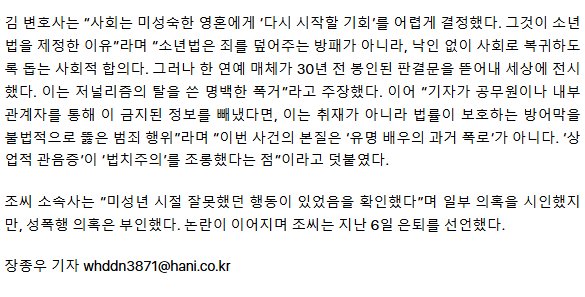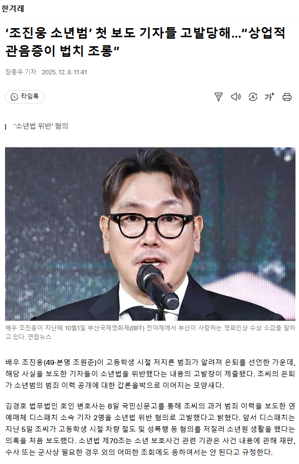 ‘조진웅 소년범’ 첫 보도 기자들 고발당해… “상업적 관음증이 법치 조롱”ㅡ 디스패치, 소년법 제70조 김경호변호사