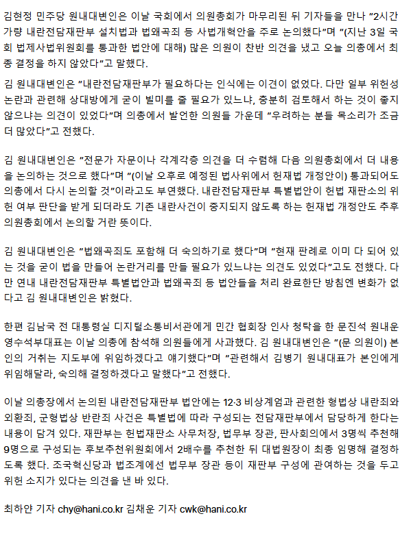 민주 ‘내란전담재판부 의총’ 다시 열기로… 연내 처리는 불변