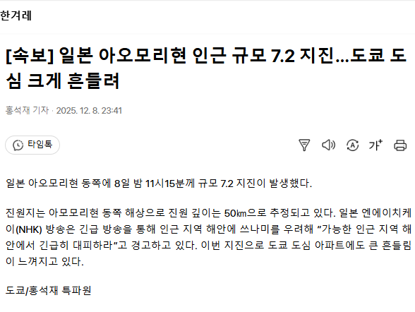 [속보] 일본 아오모리현 인근 규모 7.2 지진… 도쿄 도심 크게 흔들려