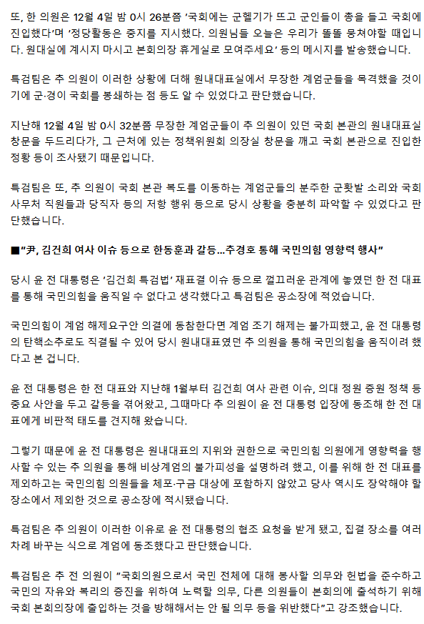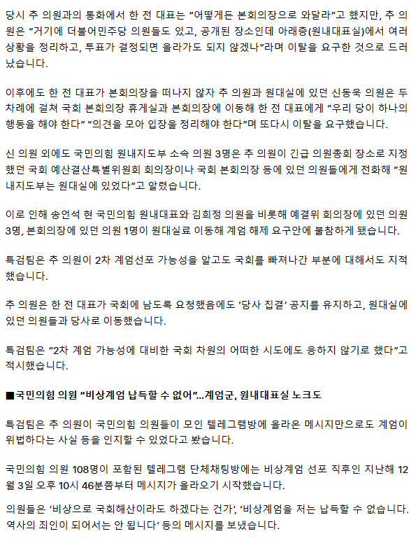 내란특검 “추경호, 한동훈에 본회의장 이탈 요구… 국힘 지도부도 동참”ㅡ추경호, 한동훈을 구속하라