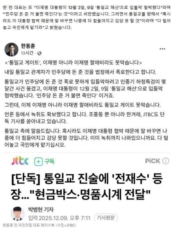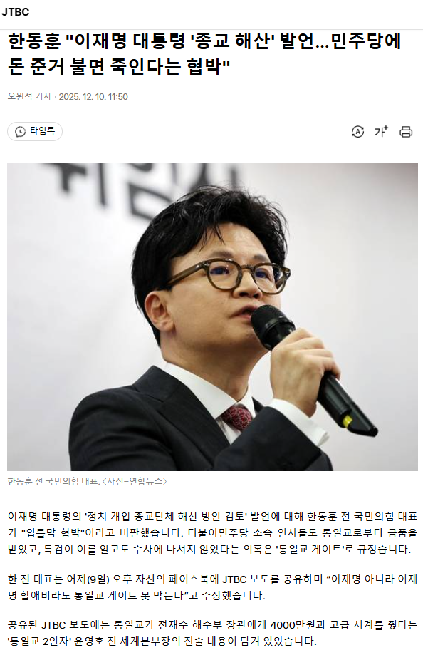 한동훈 "이재명 대통령 '종교 해산' 발언… 민주당에 돈 준거 불면 죽인다는 협박"ㅡ 협박범 인증