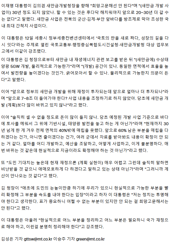 이재명 대통령 "새만금, 희망고문 안 돼… 현실적으로 정리할 부분 정리해야"