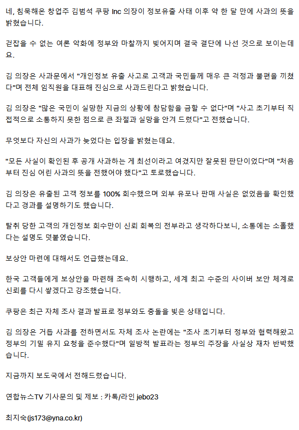 김범석, 쿠팡 사태 첫 사과…"대응미흡·소통부족"ㅡ 미국에서 집단소송하니까 사과하네