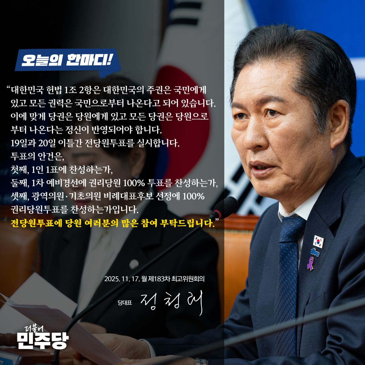 제183차 최고위원회의 모두발언 □ 일시 : 2025년 11월 17일(월) 오전 10시 30분□ 장소 : 국회 본청 당대표 회의실 ■ 정청래 당대표 ‘정말 노고가 많으셨다. 감사드린다(이재용 삼성 회장), 신중하고 결단력 있는 리더십으로 협상을 잘 이끌어 주셨다(최태원 SK회장), 이번에 지켜보니까 대통령의 배짱과 뚝심이 대단했다. 오늘 아침 미국에 있는 로비스트들이 한국 정부가 대단하다고 그랬다. 진심으로 존경한다(서정진 회장), 핵잠 건조라는 성과에 경의를 표한다. 한국의 국격이 올라가고, 아시아 태평양 지역 안보가 강화될 것으로 기대가 크다(여승주 한화 부회장)’ 대기업 총수들이 이렇게 대통령에게 공개적으로 감사 표현을 한 경우가 있었는지 저는 잘 기억이 없습니다. 그만큼 이번 APEC과 한미 관세 협상이 매우 성공적이었다는 것을 대기업 총수들께서 인정하고 대통령께 감사드리고 있는 것 같습니다. 이런 엄청난 외교적 성과가 있던 것을 우리는 객관적으로 바라볼 필요가 있겠다는 생각이 듭니다. 저와 김병기 원내대표가 방금 성남 공항에서 이재명 대통령의 중동, 아프리카 순방 외교 떠나시는 길을 배웅하고 왔습니다. 아랍에미리트, 이집트를 거쳐, 남아프리카공화국 G20정상회의 참가 후 튀르키예 방문을 끝으로 하는 다자외교 무대에 방금 떠나셨습니다. 글로벌 무역·통상 전쟁 속에서도 실용을 챙겼고 멈춰있던 셔틀 외교를 복원했습니다. 이제 회복과 복구를 넘어 미래를 가리키는 대한민국으로 외교 지평을 넓히고 있습니다. 참 자랑스럽습니다. 이번 일정도 성공적으로 마무리되길 바라며 민주당도 든든히 뒷받침하겠다는 말씀을 드립니다. 당원주권시대를 활짝 열겠습니다. 전당대회 때 ‘1인 1표’를 제가 약속했습니다. 19일, 20일 이틀간 이에 대한 전당원 투표를 실시합니다. 대한민국 헌법 1조 2항은 ‘대한민국의 주권은 국민에게 있고 모든 권력은 국민으로부터 나온다’라고 되어 있습니다. 이에 걸맞게 ‘더불어민주당의 당권은 당원에게 있고 모든 당권을 당원으로부터 나온다’는 당원 정신이 반영되어야 하겠습니다. 이 헌법정신이 온전히 구현되는 것이 국민 주권 시대이고 당원 주권 시대입니다. 저는 지난 전당대회에서 강력한 개혁 당대표로 이재명 정부의 국민 주권 시대에 걸맞은 당원 주권 시대, 1인 1표 시대를 열겠다고 약속했습니다. 그 약속을 실천하겠습니다. 나라의 주인이 국민이듯이 당의 주인은 당원입니다. 나라의 선거에서 국민 누구나 1인 1표를 행사하듯이 당의 선거에서도 누구나 1인 1표를 행사해야 합니다. 국회의원도 1표, 대의원도 1표, 당원도 1표이어야 합니다. 이것이 보통·평등·직접·비밀 선거를 보장하고 있는 헌법정신입니다. 1인 1표 시대에 따르는 보완점 예를 들어, 한국노총과 전략 지역에 대한 배려는 표로서 하는 것이 아니라, 다른 정책적 배려를 통해 충분하게 반영하겠습니다. 이미 수차례 논의를 통해 보완책이 마련되었습니다. 당원들께 약속드린 대로, 평당원 최고위원 제도는 이미 시행되고 있으며 당원 교육 강화를 위해 역량 있는 강사의 강의와 제가 직접 연사로 나서는 당원 교육도 현재 활발하게 실시되고 있습니다. 당원 포상제 확대와 당원주권의 날 행사도 준비 중에 있습니다. 더불어민주당은 명실 공히 당원이 주인인 정당, 권리당원의 권리가 최대한 보장되는 당원 주권 정당 시대로 진입합니다. 내년에 실시되는 6.3지방선거에서 열린 공천 시스템으로 공천 혁명을 이룩하겠습니다. 몇몇 힘 있는 인사가 공천권을 좌지우지하던 폐습을 끊어내고, 당원이 전면적으로 참여하여 당의 후보를 공천하는 당원 주권 시대, 권리당원 열린 공천 시대를 열겠습니다. 예비후보자 검증을 통과한 후보는 누구라도 경선에 참여시키겠습니다. 이제 억울한 컷오프로 눈물을 흘리는 후보는 없을 것입니다. 예비 후보자 검증 위원회를 통과한 예비후보가 많을 경우, 권리당원 100% 참여로 1차 조별 예비 경선을 치를 것입니다. 2차 본선은 권리당원 50%와 일반 국민 50% 선호투표제로, 50% 이상 득표자를 후보로 결정하는 결선 투표 제도를 도입해서 강력한 후보를 공천하겠습니다. 광역·기초 비례대표 후보자도 100% 권리당원 투표제를 도입하겠습니다. 이제 더불어민주당의 진정한 주인은 국회의원이 아니라 당원입니다. 당원이 국회의원의 눈치를 보는 시대가 아니라, 국회의원이 당원의 눈치를 보는 시대로 변화·발전하고 있습니다. 정치란 무엇입니까? 정치란 의사결정 또는 의사결정 과정의 모든 행위입니다. 국가의 운명과 의사결정은 전체 국민이 참여해야 합니다. 당의 운명과 의사결정도 당원이 참여해야 합니다. 장충체육관의 1만 명만 모아놓고 대통령을 뽑던 시절이 있었습니다. 당 총재 영향력 하에 있는 대의원만 모아놓고 당의 의사결정을 하던 시절도 있었습니다. 이것은 민주주의가 아닙니다. 민주주의 역사는 보통·평등·직접·비밀 투표권을 보장받기 위한 피눈물 나는 투쟁의 역사입니다. 우리 대한민국은 1894년 동학농민혁명의 인내천 정신, 나라의 주인이 왕이 아니라 백성이라는 민주주의 깃발을 올린 이후, 민주주의를 향한 피 끓는 여정