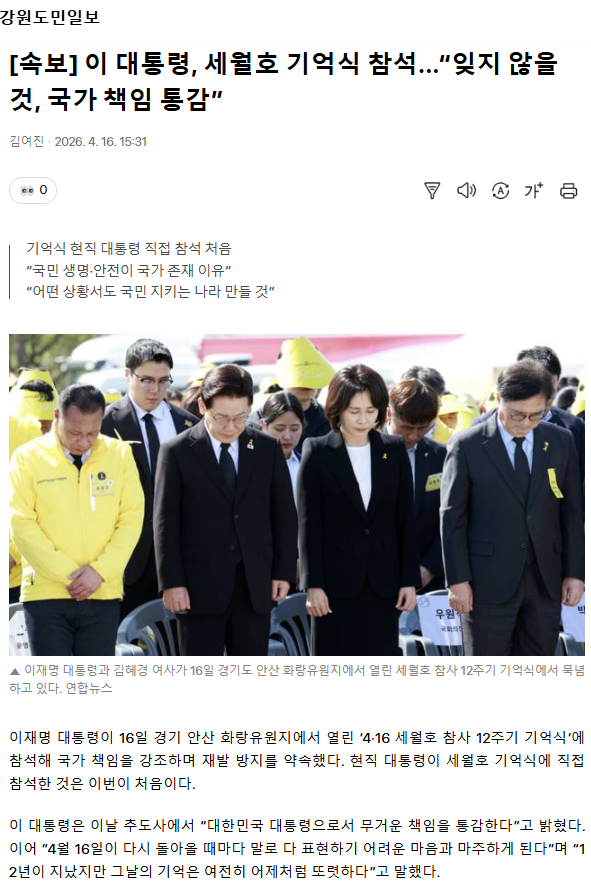 [속보] 이 대통령, 세월호 기억식 참석... “잊지 않을 것, 국가 책임 통감”