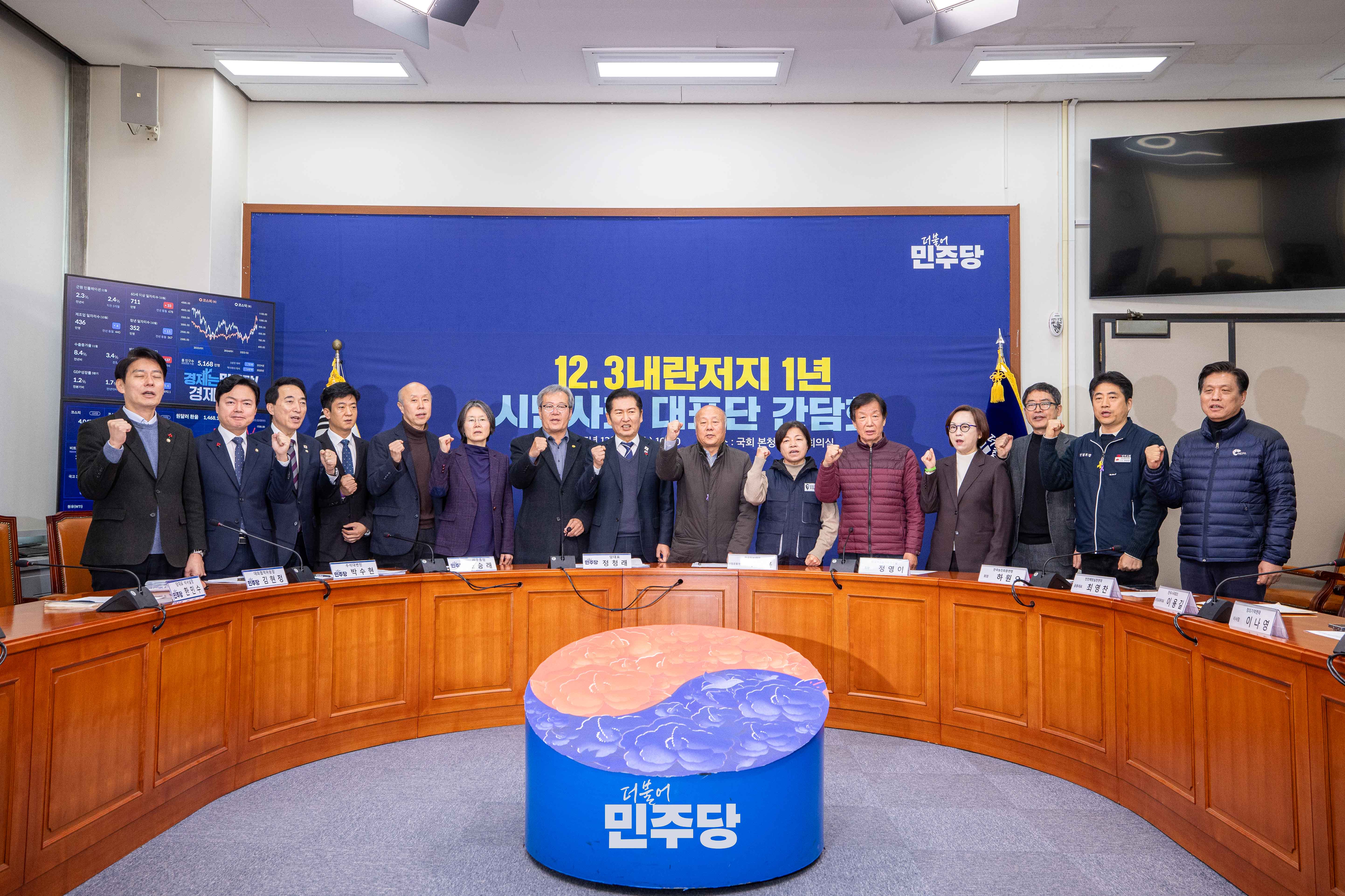 정청래당대표가 2025.12.03.(수) 국회 본청 당대표회의실에서 열린 12.3 내란저지 1년 시민사회 대표단 간담회에 참석하여 기념촬영을 하고 있다.