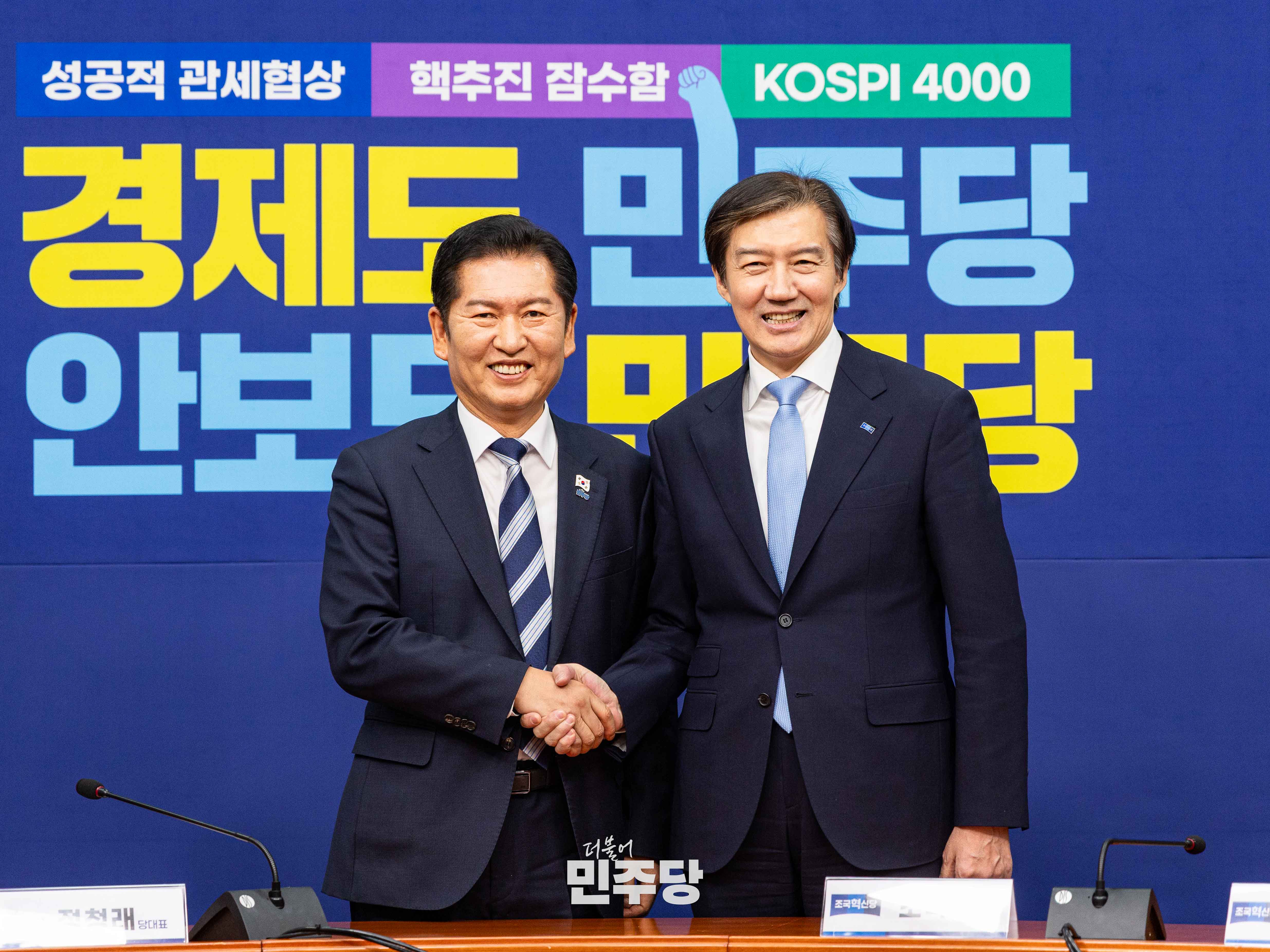 정청래 당대표가 2025.11.26.(수) 국회 본청 당대표회의실에 예방한 조국혁신당 조국 당대표를 맞이하고 기념촬영을 하고 있다.