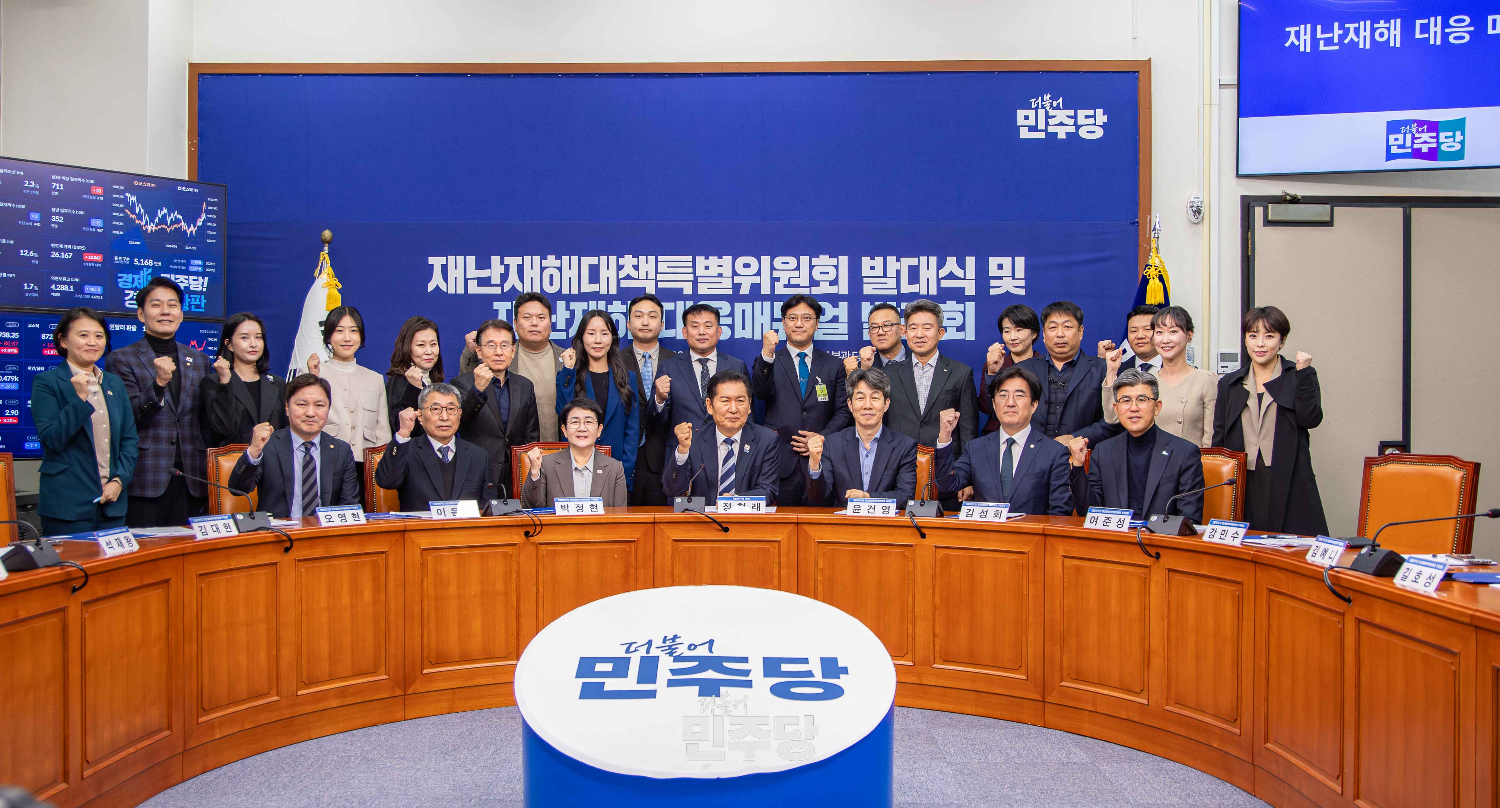 정청래 당대표가 2025.11.26.(수) 국회 본청 당대표회의실에서 열린 재난재해대책특별위원회 발대식 및 재난재해 대응매뉴얼 발표회에 참석하여 기념촬영을 하고 있다.