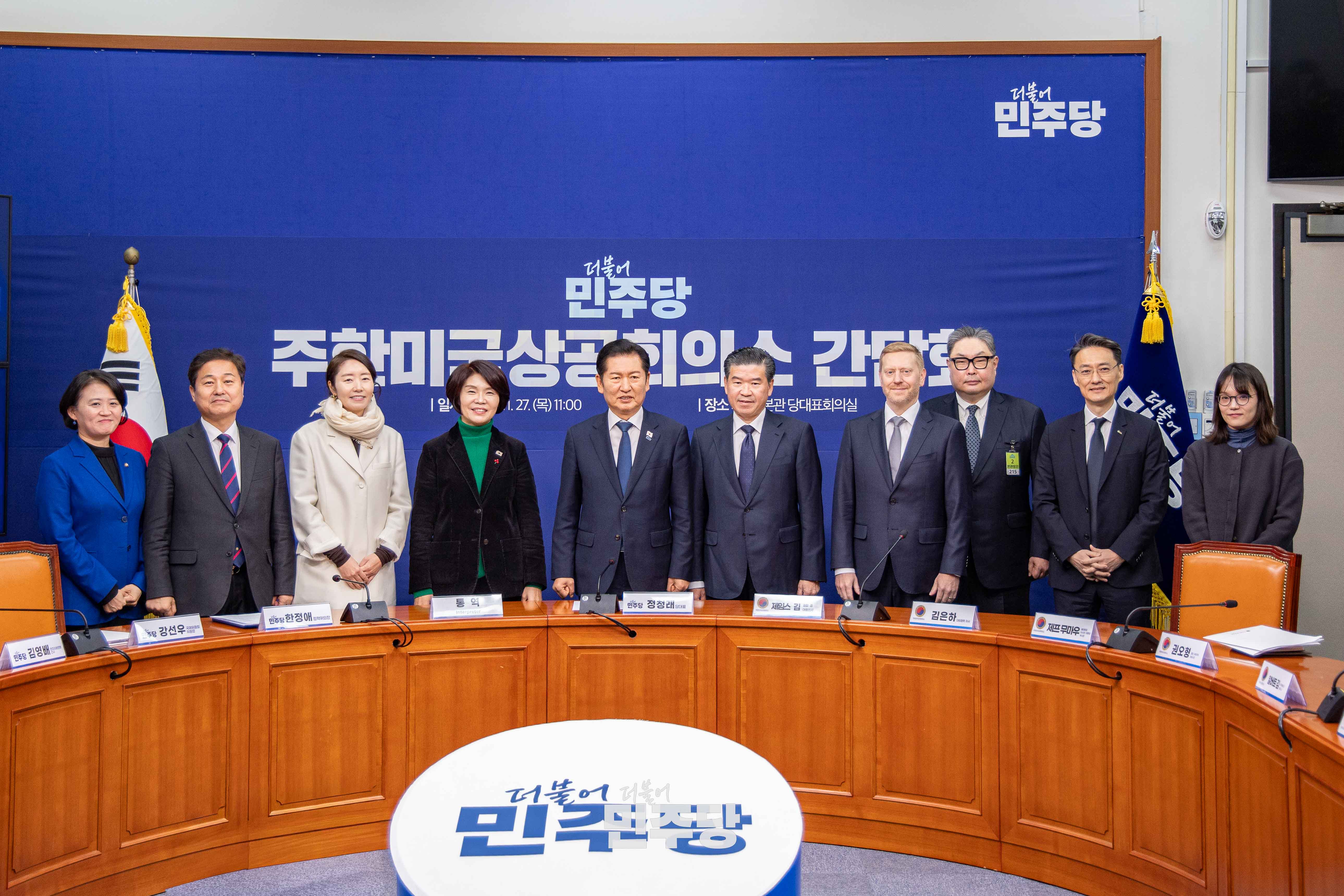정청래 당대표가 2025.11.27.(목) 국회 본청 당대표회의실에서 열린 주한미국상공회의소 간담회에 참석하여 기념촬영을 하고 있다.
