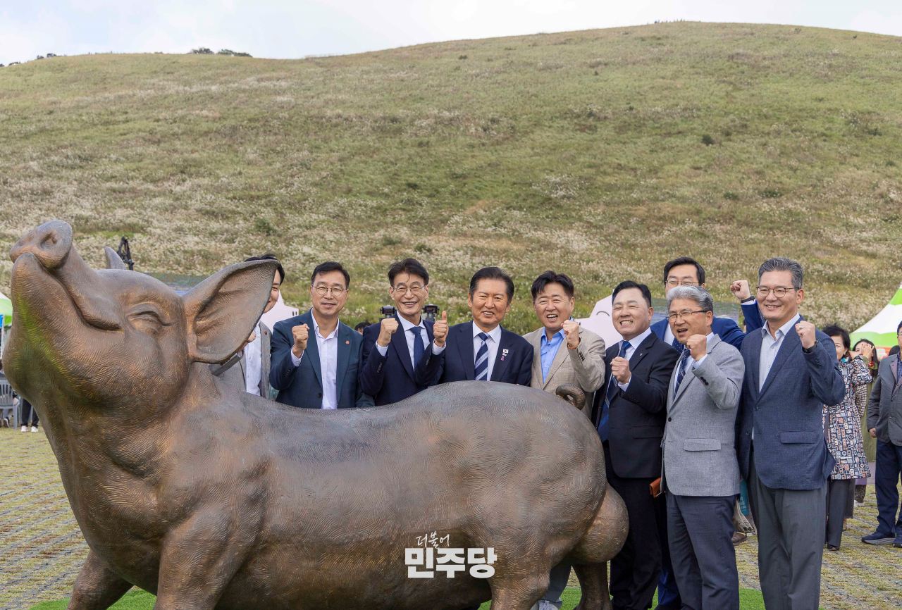 정청래 당대표가 2025.10.25.(토) 제주 제주시 애월읍에 위치한 새별오름에서 열린 2025 제주 도새기축제에 방문하여 기념촬영을 하고 있다.