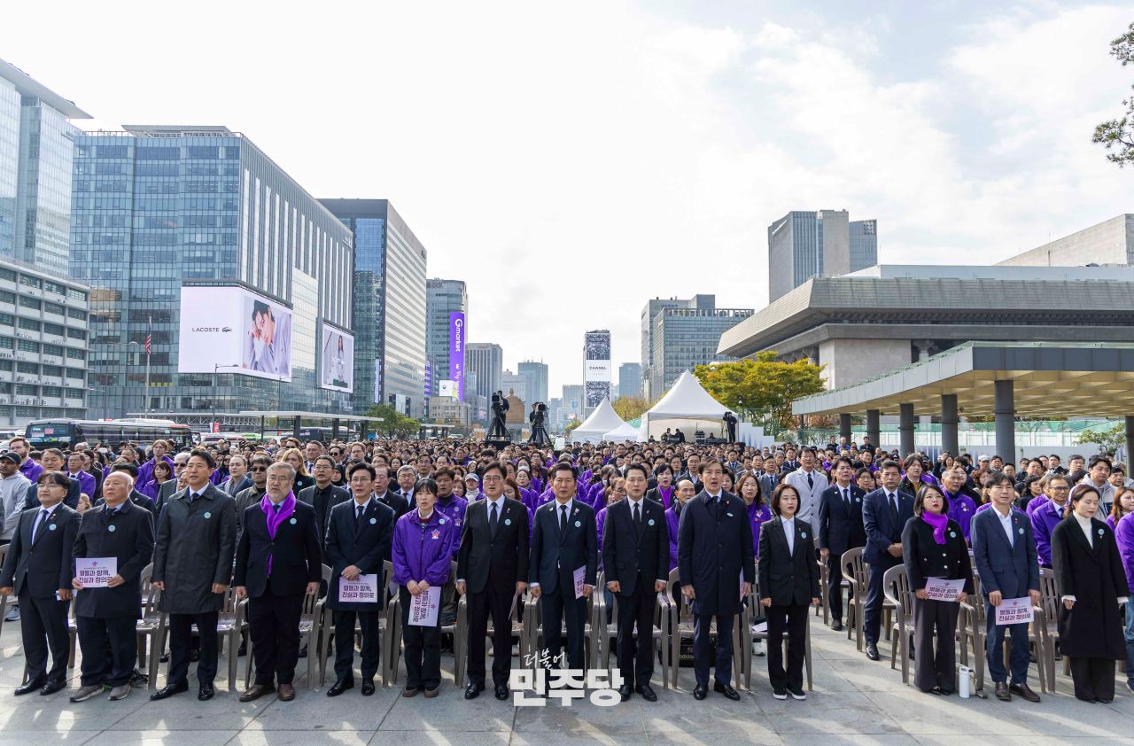 정청래 당대표가 2025.10.29.(수) 서울 중구 광화문광장에서 열린 10.29 이태원참사 3주기 기억식에 참석하여 참사 희생자에 대한 묵념을 하고 있다.