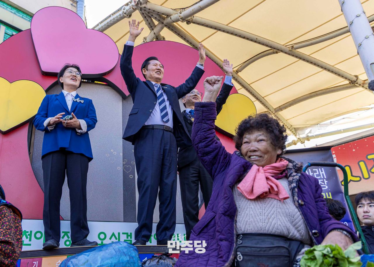 정청래 당대표가 2025.11.02.(일) 전남 순천시에 위치한 순천아랫장에 방문하여 시장상인들과 인사를 나누고 있다.