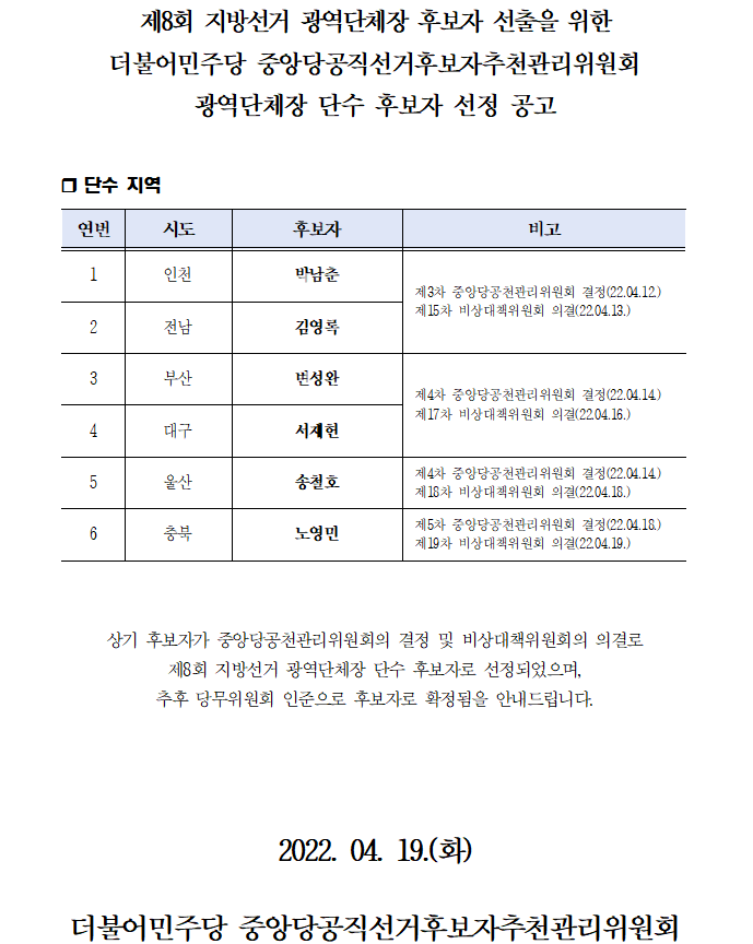 제8회 지방선거 광역단체장 후보자 선출을 위한 더불어민주당 중앙당공직선거후보자추천관리위원회 광역단체장 단수 후보자 선정 공고