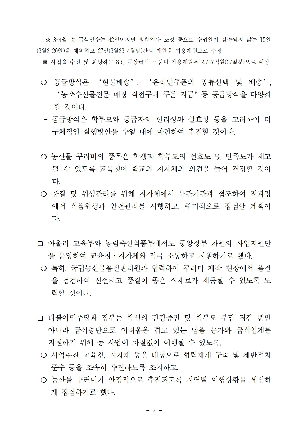 초중고 가정 농산물꾸러미 지원사업 당정협의 결과