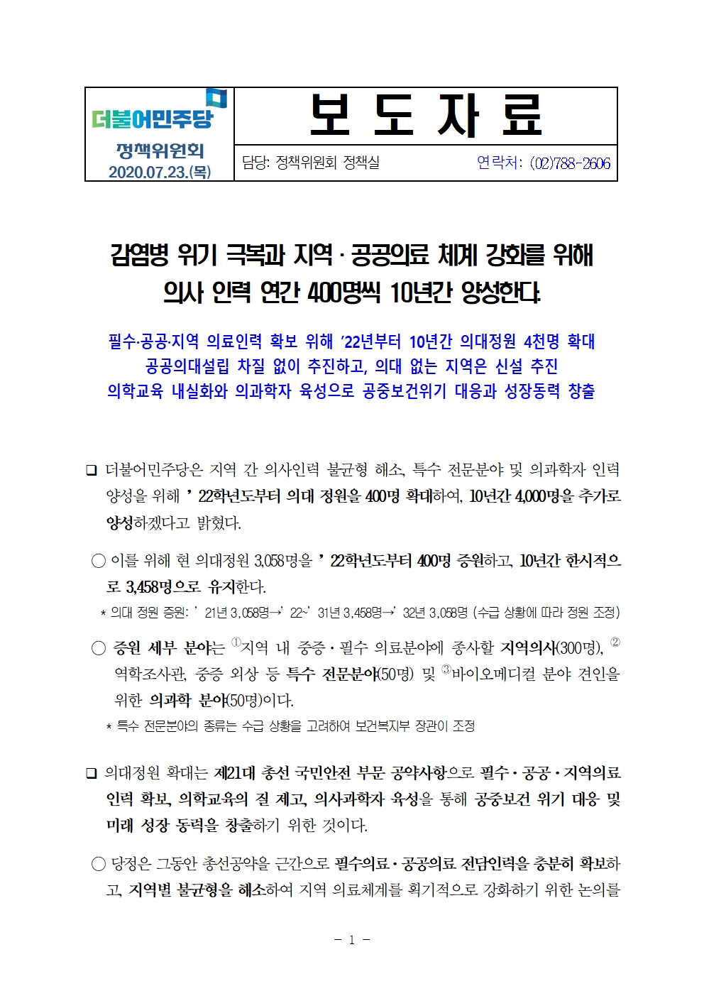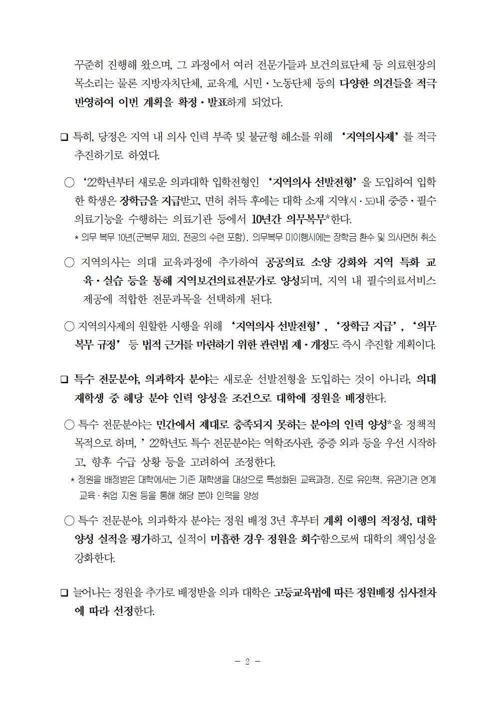 공공의료 인력확충(의대정원확대 및 공공의대 설립 추진방안) 당정협의 보도자료