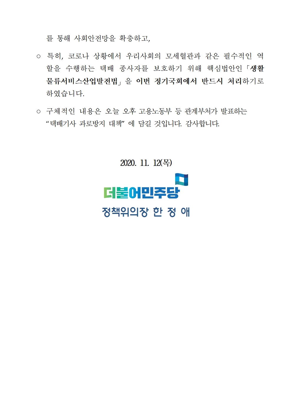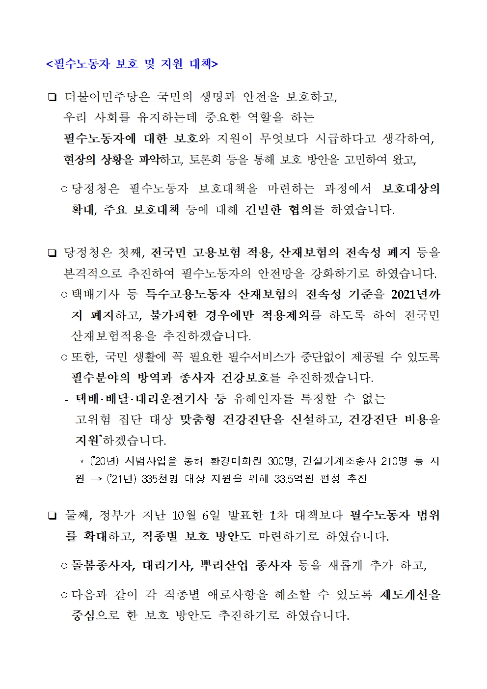 필수노동자 보호 및 지원 대책 당정청 협의 결과