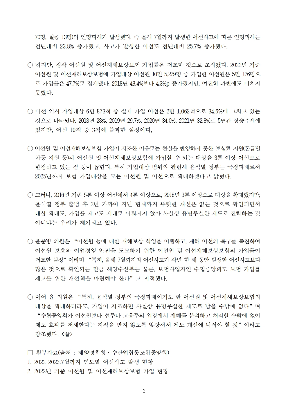 [윤준병 의원 국정감사 보도자료] 윤준병 의원, “어선원에게 외면받고 있는 윤석열 정부 국정과제”