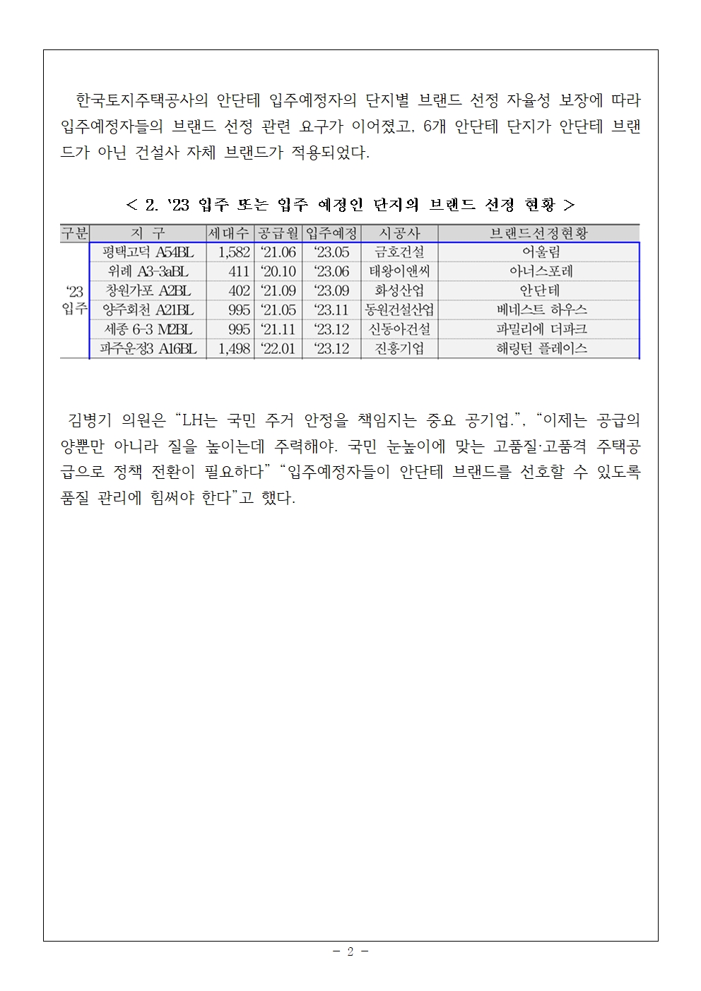 [국회의원 김병기 보도자료] LH 고급아파트 브랜드 '안단테', 정작 입주예저자들은 건설사 브랜드 선호
