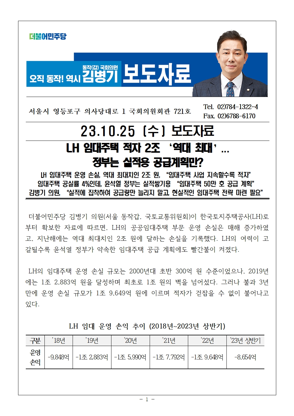 231025_김병기의원_보도자료_LH 임대주택 적자 2조 역대 최대... 정부는 실적용 공급계획만.hwp