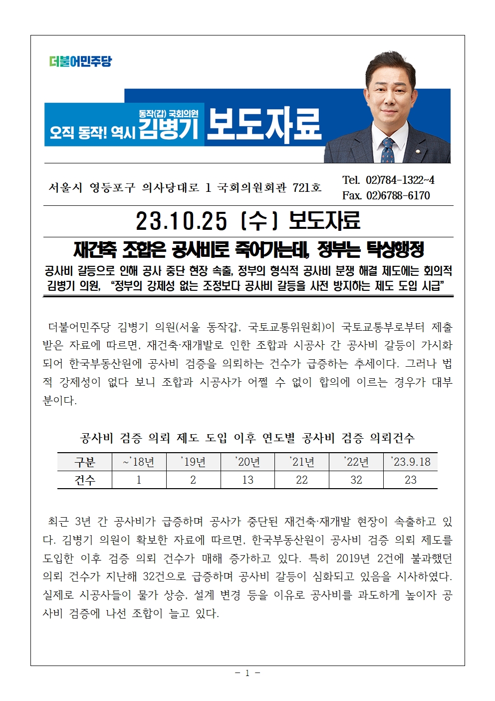 [국회의원 김병기 보도자료] 재건축 조합은 공사비로 죽어가는데, 정부는 탁상행정
