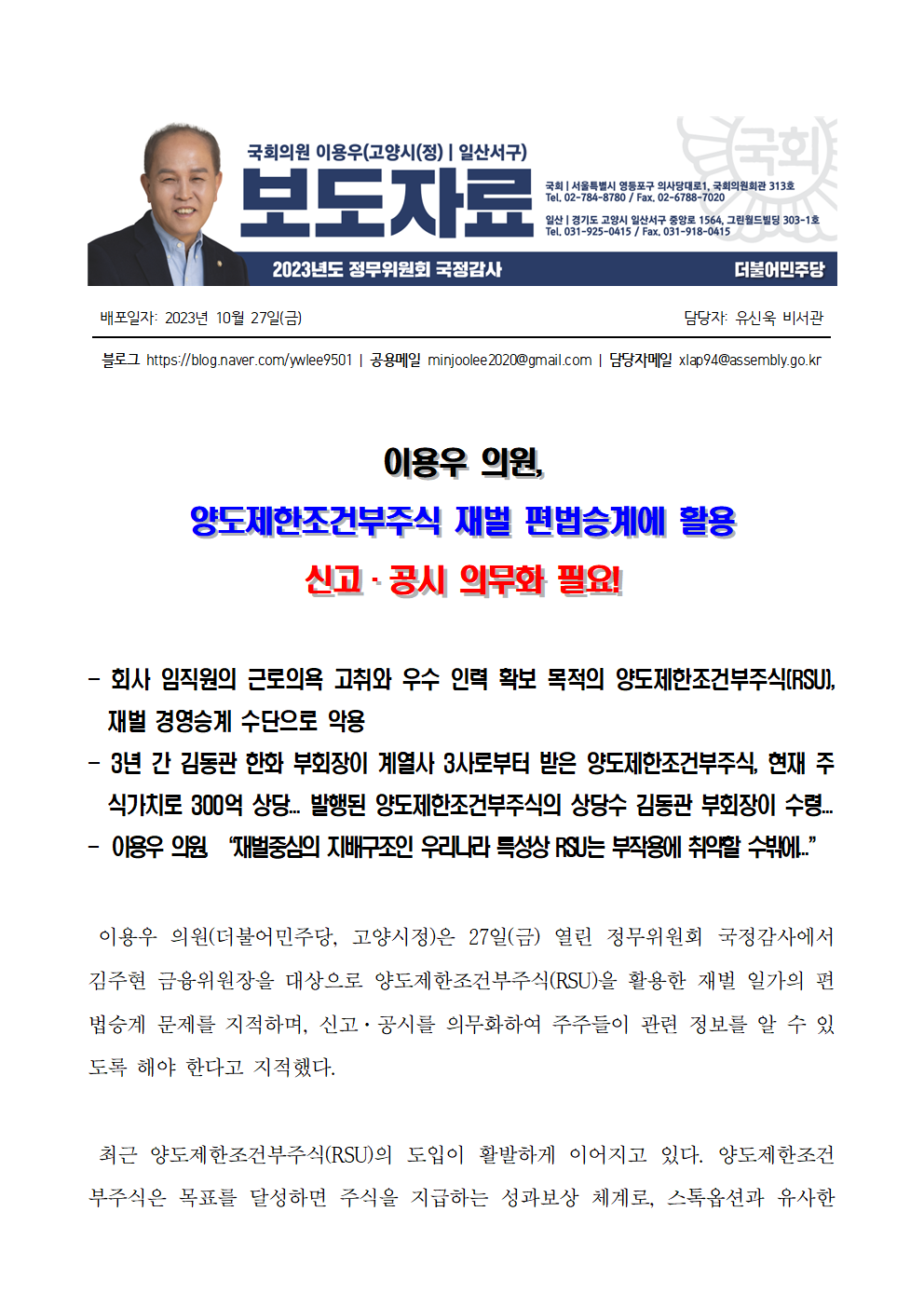 [보도자료] 이용우 의원_ 양도제한조건부주식 재벌 편법승계에 활용...신고·공시 제도 도입 필요!.hwp