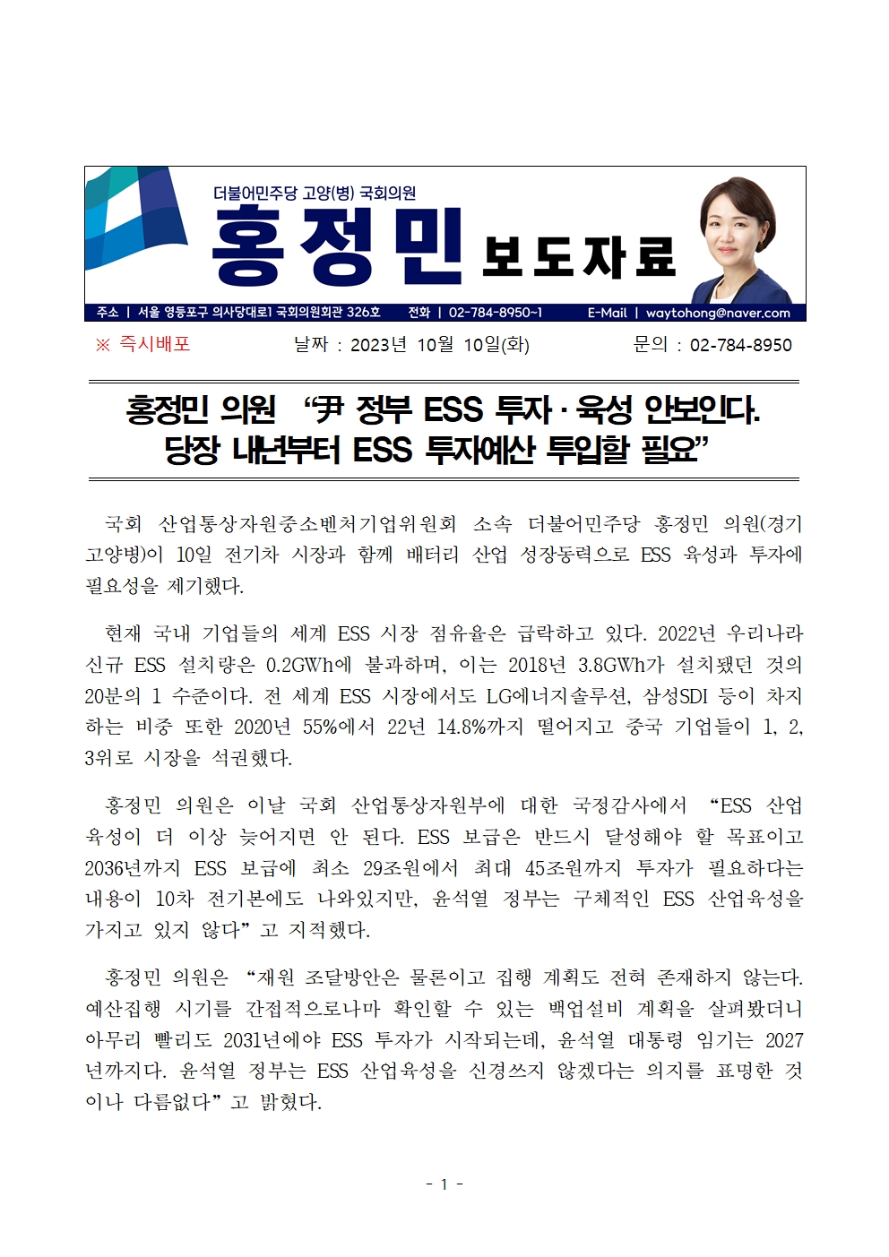 231010_보도자료_홍정민 의원 尹 정부 ESS 투자·육성 안보인다_최종.hwp