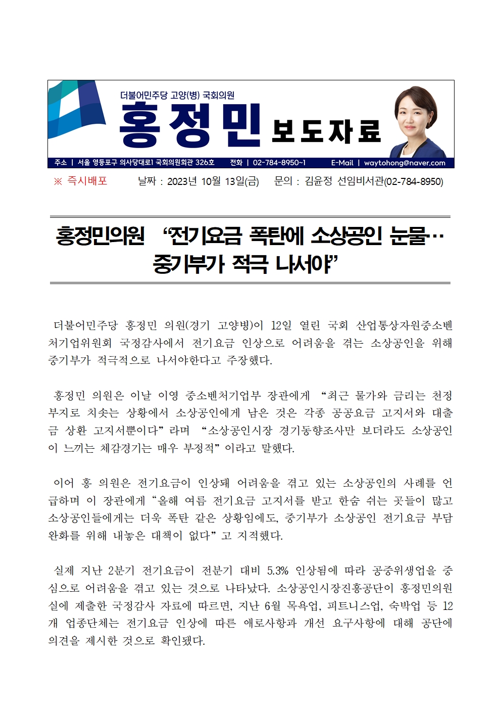 231013_보도자료_홍정민의원_ 전기요금 폭탄에 소상공인 눈물_ 중기부가 나서야.hwp