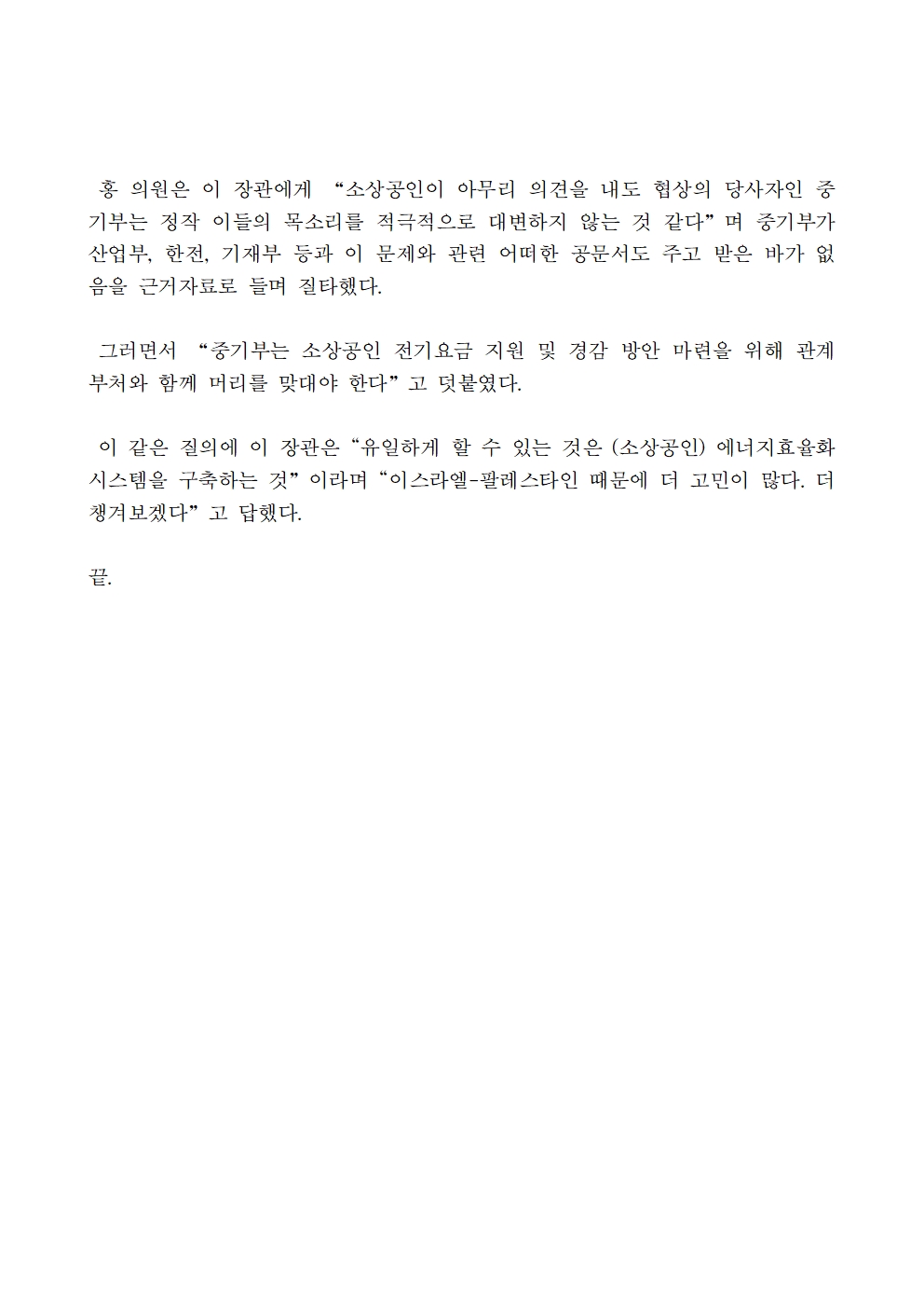 [홍정민 의원 보도자료] 전기요금 폭탄에 소상공인 눈물… 중기부가 적극 나서야